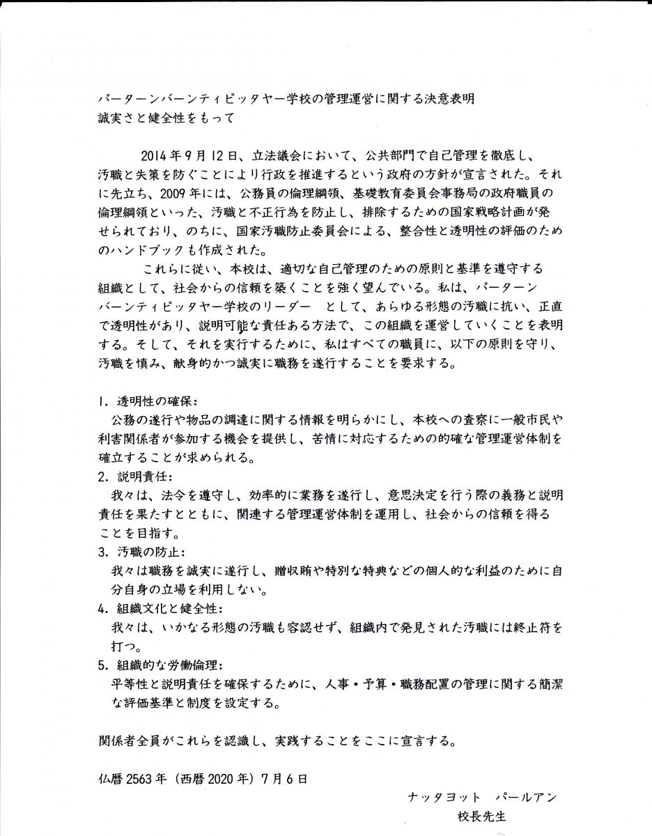 ผู้อำนวยการณัฏฐยศ ป่าหลวง ประกาศเจตจำนงค์สุจริตในการบริหารงาน ตามนโยบายในการส่งเสริม