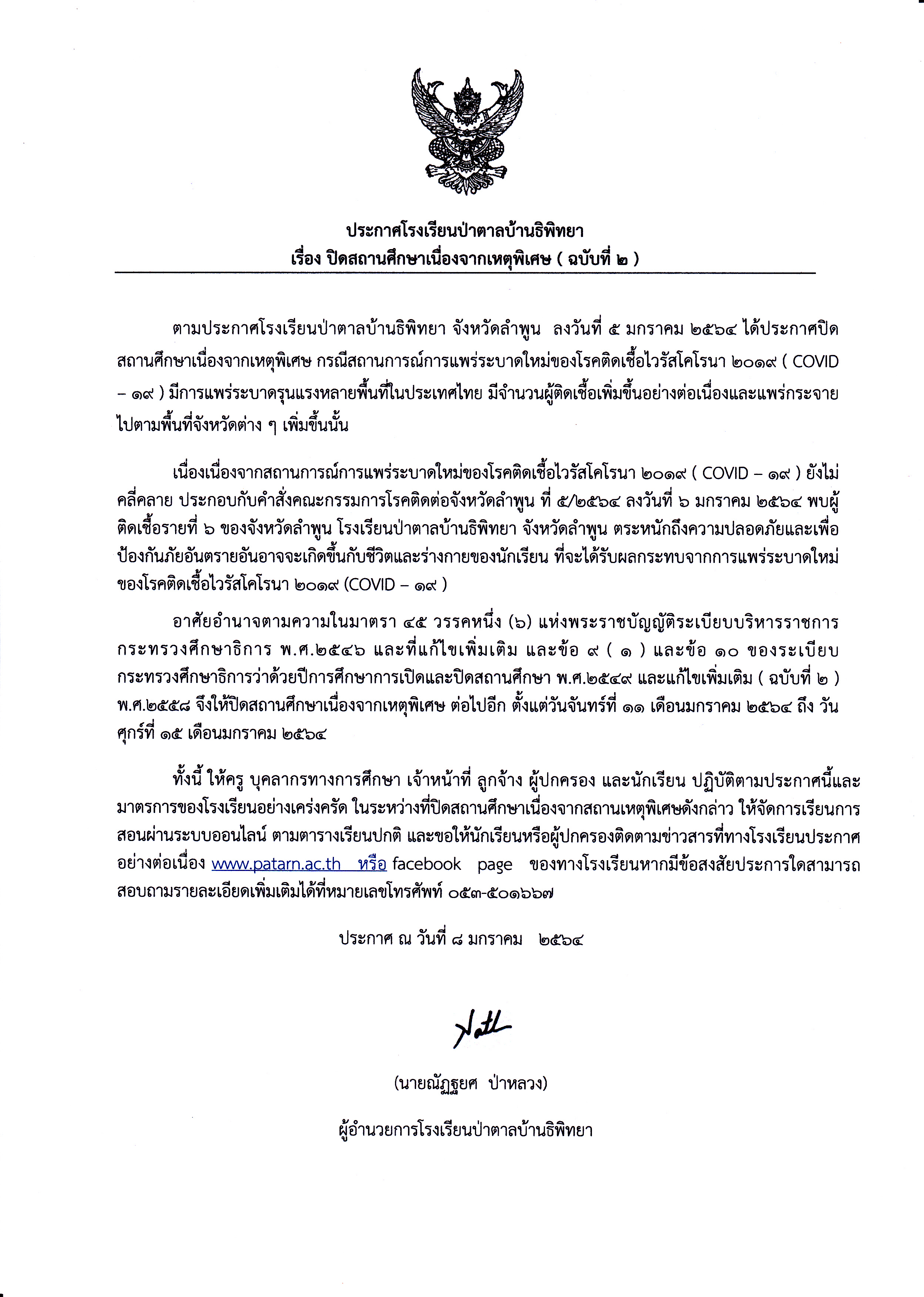 ประกาศปิดโรงเรียนกรณีพิเศษ ฉบับที่ 2