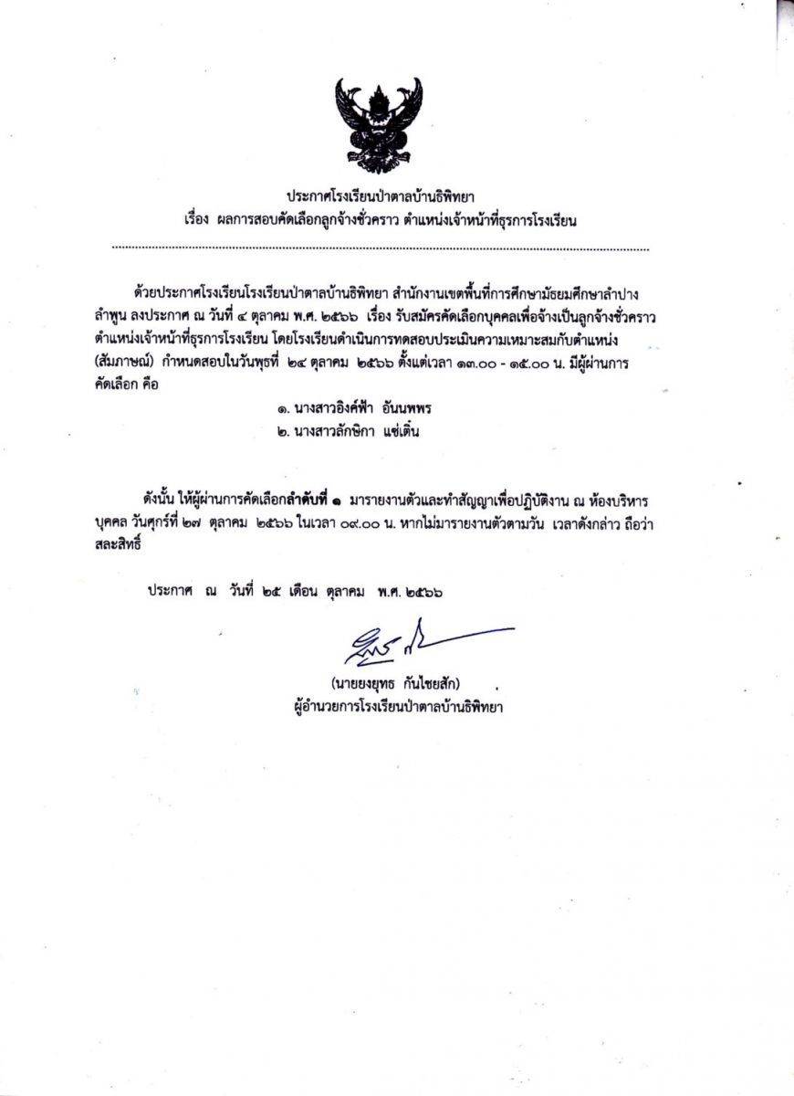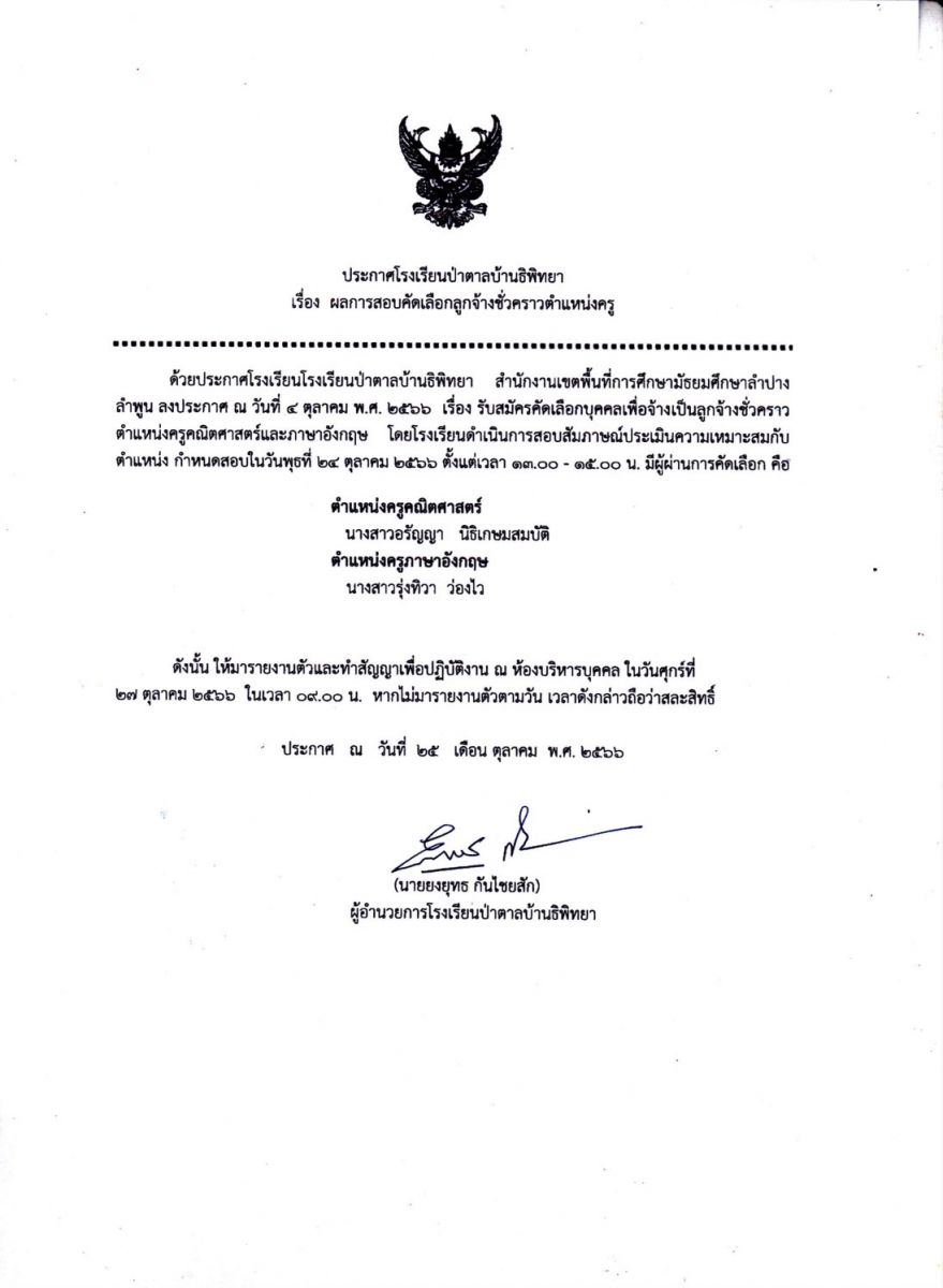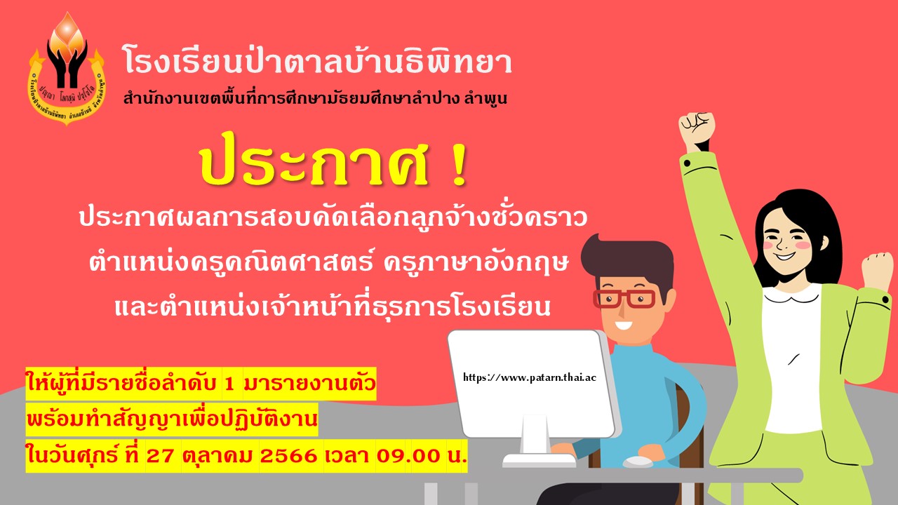 ประกาศผลการสอบคัดเลือกลูกจ้างชั่วคราวตำแหน่งครูคณิตศาสตร์ ครูภาษาอังกฤษ และตำแหน่งเจ้าหน้าที่ธุรการโรงเรียน