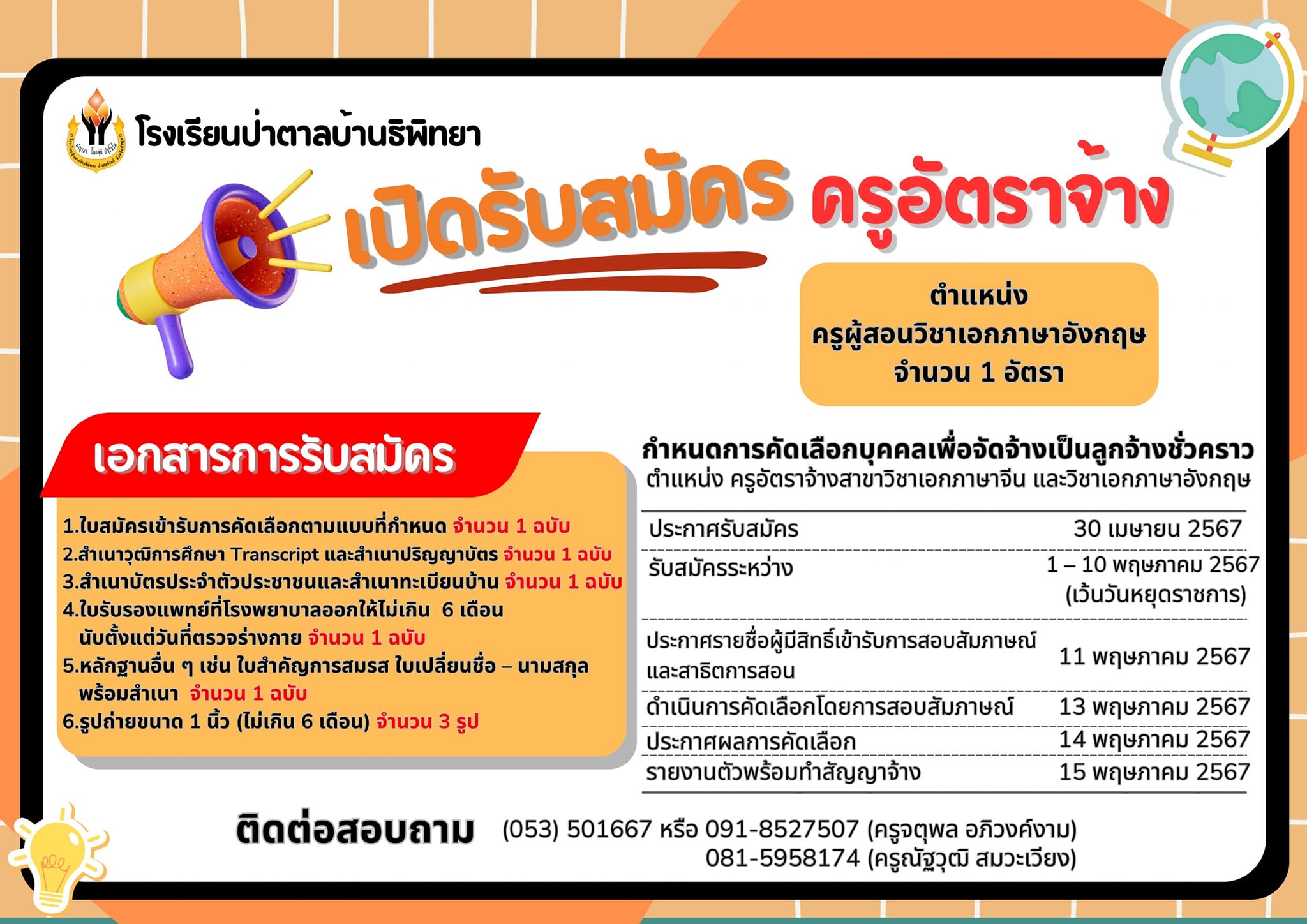 ประกาศโรงเรียนป่าตาลบ้านธิพิทยาเปิดรับสมัครบุคคลทั่วไปเพื่อเป็นลูกจ้างชั่วคราวตำแหน่งครูอัตราจ้างวิชาเอกภาษาอังกฤษ จำนวน 1 อัตรา