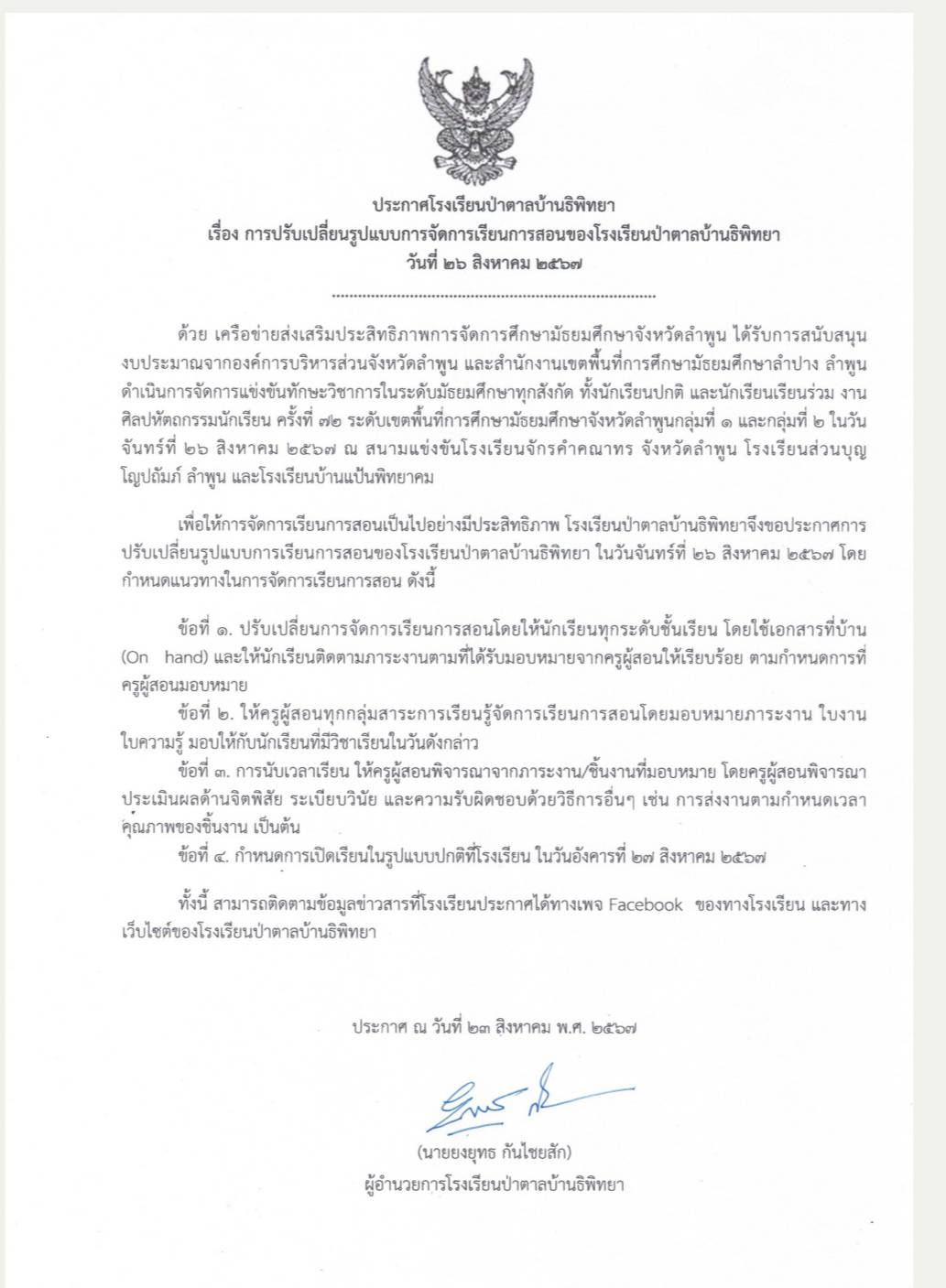 การปรับเปลี่ยนรูปแบบการจัดการเรียนการสอนของโรงเรียน ;วันที่ 26 สิงหาคม 2567